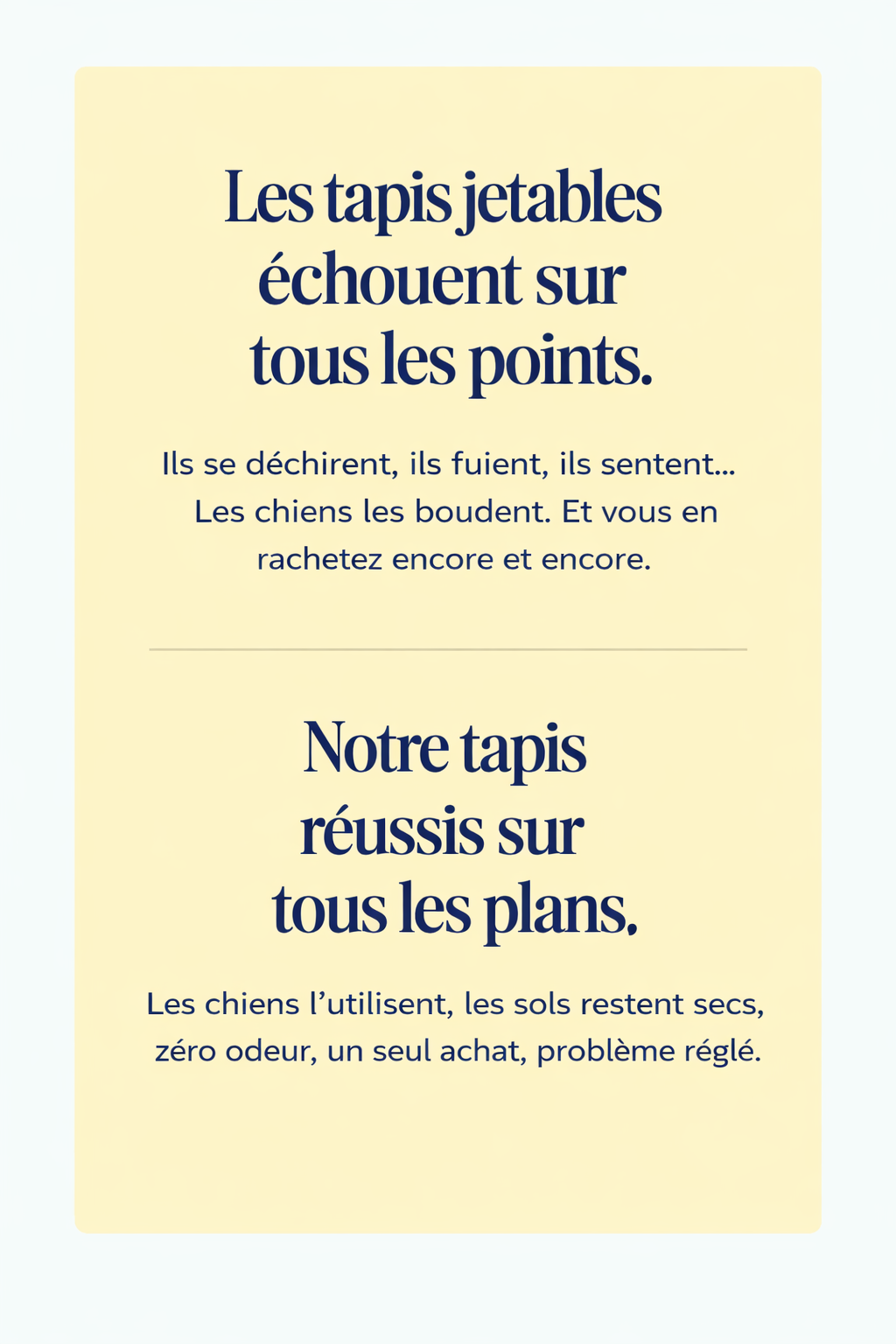 Les tapis jetables n’en offrent aucun. Ils sentent le plastique et les produits chimiques. Pour les 300 millions de récepteurs olfactifs de votre chien, ce n’est pas un “coin toilettes”… C’est simplement un objet étrange posé sur le sol.